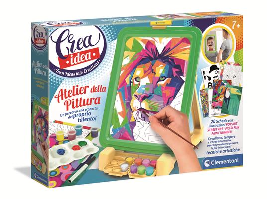 Dalla street art alla pop art e al paint numbers fino alla costruzione di filtri personalizzati. Un divertente percorso alla scoperta del proprio talento e delle diverse correnti artistiche! Tutto il mondo del disegno in un gioco per scoprire il proprio talento. Perfetto per dilettarsi nell'arte del disegno sperimentando tante tecniche diverse e originali. Un kit ricco per provare e riprovare! Non solo teoria, ma anche pratica grazie ai tanti materiali contenuti nel gioco. Un simpatico cavalletto trasformabile che all'occorrenza diventa lavagna con ventose per provare la tecnica del ricalco appoggiandola alla finestra. Il gioco contiene: tempere normali, fluo, metallizzate, matita, pennello, pennarello, cartoncini predefiniti e outline per guidare il bambino alla sperimentazione delle diverse tecniche di disegno. La cura del dettaglio e l'attenzione all'ergonomia garantiscono un prodotto unico e studiato per le esigenze dei bambini.