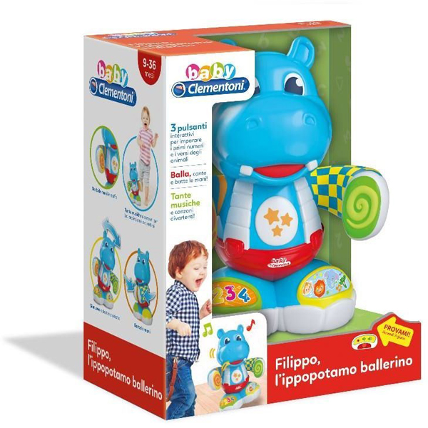 Il simpatico ippopotamo batte le morbide zampe mentre balla e invitando il bambino a seguirlo nel gioco, e lo supporta nello sviluppo del senso del ritmo e delle capacità motorie.