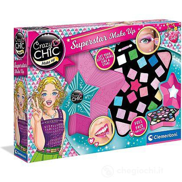 Una splendente trousse a forma di stella per realizzare un make up unico e brillare come una vera star! La trousse contiene: lucidalabbra, ombretti, fondotinta e 2 applicatori. Include anche uno specchietto a forma di stella. La stella è pensata per essere anche un bellissimo oggetto da tenere sulla scrivania, pronto all'uso per divertirsi da sola o con le amiche oppure per un ritocco del make up last minute! Tutti i trucchi sono rimovibili facilmente con acqua e sono realizzati con materiali atossici, assolutamente sicuri e testati. Età consigliata: + 6 anni.