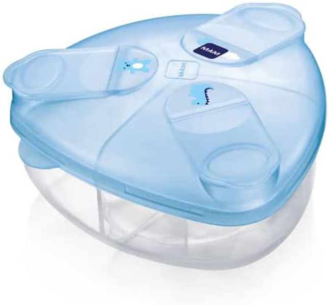 Mam milk box contenitore latte in polvere triangolare – tre porzioni sempre a portata di mano quando si è in giro è fondamentale avere sempre con sé tutto l’occorrente per il bebè, e portare latte in polvere e integratori può diventare complicato. per risolvere il problema la soluzione migliore è mam milk box contenitore latte in polvere, un accessorio, moderno, originale e del tutto affidabile. suddiviso in tre comodi scomparti da 40 g di capacità ciascuno, il porta latte in polvere è leggero e poco ingombrante, tuttavia molto capiente. la particolare forma triangolare rende più semplice versare completamente il contenuto nel biberon, mentre il tappo anti-goccia a scatto assicura un uso facile, senza perdite di prodotto. la forma piatta si adatta a qualsiasi tipo di borsa, rendendo il trasporto semplice. ciascuno scompartimento può contenere una giusta porzione di latte in polvere e grazie alla base trasparente i genitori possono sempre controllare il contenuto. come gli altri prodotti mam, anche il contenitore per latte in polvere è privo di bpa, bps e metalli ed è lavabile in lavastoviglie o sterilizzabile in microonde. decorato nei toni dell'azzurro, il porta latte in polvere è perfetto per ogni bimbo. dettagli del prodotto: contenitore per latte in polvere con 3 scomparti capienza di 40 g per ciascuno scomparto forma triangolare tappo anti-goccia a scatto facile da usare e riempire