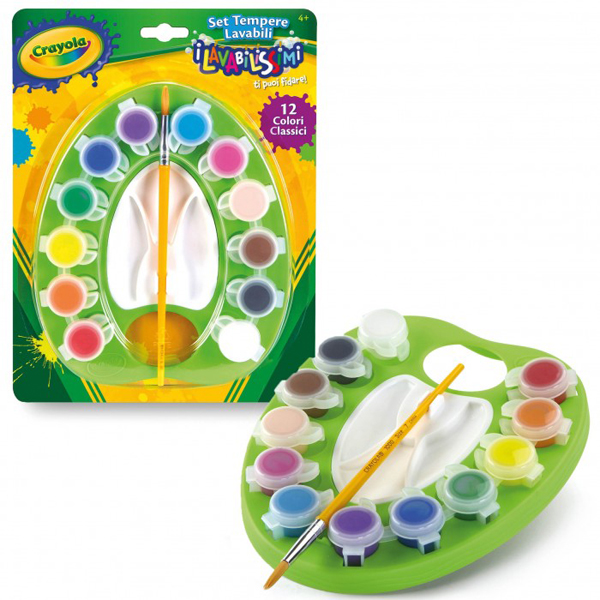 La tavolozza contiene 12 tempere colori classici in pratici vasetti richiudibili, un pennello e vaschette per miscelare i colori. I vasetti possono essere ricaricati con le tempere