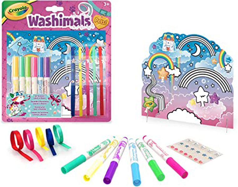 La confezione include 6 pennarelli lavabili Washimals, 1 sfondo colorabile e riutilizzabile, 5 nastri da 30 cm, 18 gemme adesive