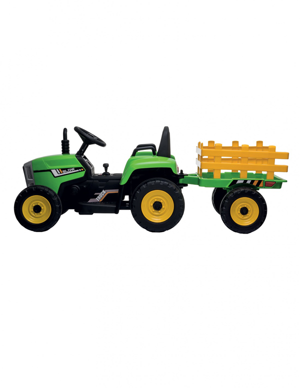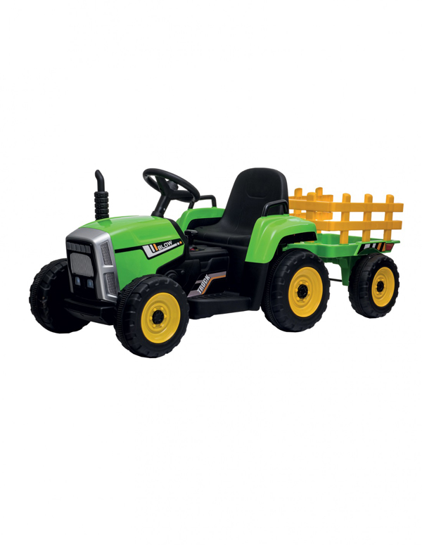 Questo trattore elettrico ha tutto quello che occorre per giocare a fare l'agricoltore: quattro ruote più due sul rimorchio posteriore, utilizzabile come portaoggetti; pomello del cambio; acceleratore a pedale per guidare in autonomia e sicurezza, grazie alla ridotta velocità della macchina, freno elettrico e ingresso USB.