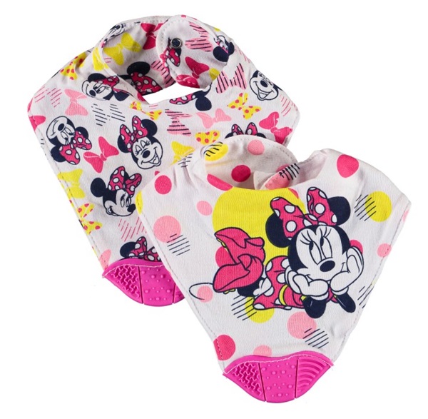 Confezione 2pz bavetta Disney Baby Minnie in varie tonalità di colore, ogni singola bavetta ha un disegno stampa di Minnie diverso, inoltre grazie al doppio strato protegge gli abiti della bambina
