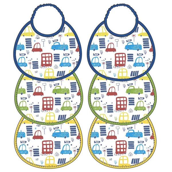 6 bavette baby cm. 18x18 in morbida spugna di cotone interamente stampata in graziosa fantasia . Profilo e lacci in cotone tinta unita. Confezione assortita in 3 differenti colorazioni