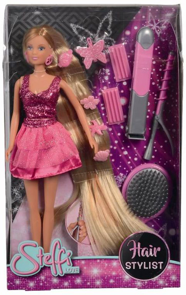 Steffy Love hair Stylist, con lunghi capelli da pettinare. Inclusi spazzola, arricciacapelli, strumento per stirare i capelli e mollettine colorate. Adatto a bambini di età superiore ai 3 anni.